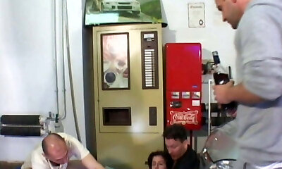 Preggers Slut Gives Blowjobs to Her Crew in Public